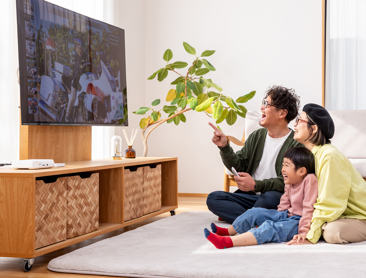 集まった写真や動画は、カレンダー上に自動整理。「おもいでばこ」をつないだテレビで上映できます。専用リモコンと定評のある快適な操作性でサクサクと写真や動画を切り替えて自在に楽しめるのは新しい体験で、「こんなところ行ったね」「懐かしい!」と、ついつい会話もはずみます。