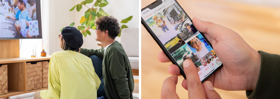 集まった写真や動画は、カレンダー上に自動で整理され「おもいでばこ」をつないだテレビで上映できます。専用リモコンと快適な操作でサクサクと写真や動画を切り替えて自在に楽しめるのは新しい体験で、「こんなところ行ったね」「懐かしい!」と、ついつい会話もはずみます。