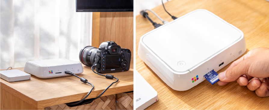 パソコンでは設定や作業が必要な写真のバックアップも専用のバックアップハードディスク(※)を使えば待機状態にするだけでを自動でバックアップします。