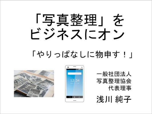 最後のスピーカーは、写真整理協会 代表理事の浅川さんです。「写真は見返すためのものなのに、紙の写真はしまいっぱなし、デジタルの写真は撮ったらそのままになっているのではないか。見るために撮った写真がそうではない状況にある。」という課題を感じ、写真整理協会を立ち上げられたそうです。